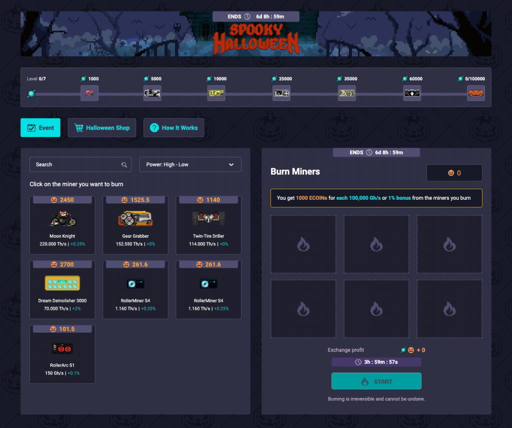 Each Miner is burned for ECoins, with the amount calculated based on the item’s power and/or bonus power. Each Rack is burned for ECoins, with the amount calculated based on the item’s cell number and/or bonus percentage.