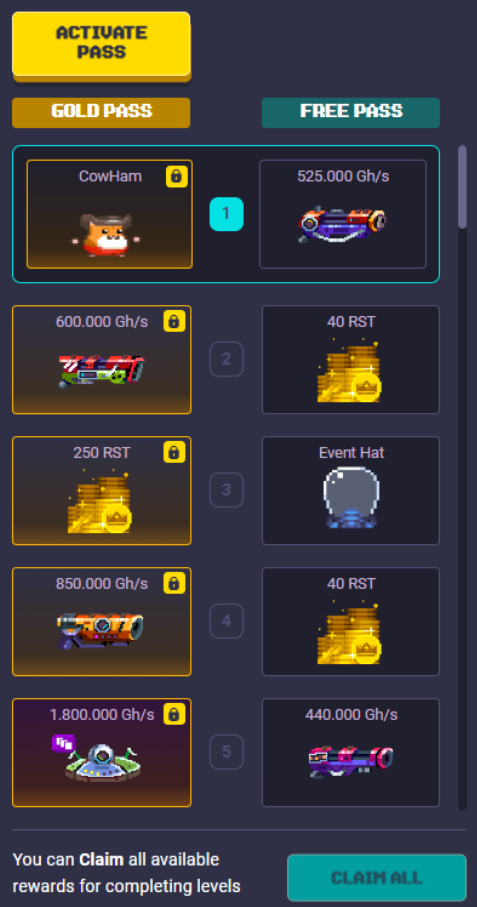 To be able to redeem **Gold** rewards also, be sure to click on the «Activate Pass» button and buy a **Gold Pass**!