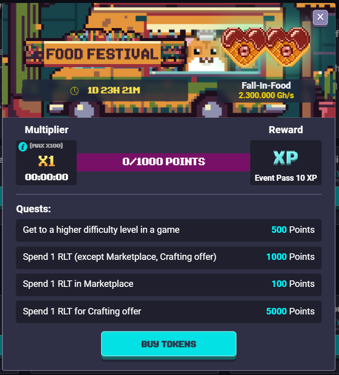 To progress faster, a multiplier can be applied! It activates automatically when you spend RLT—you get x0.1 (up to 100) for every 1 RLT you spend. But that’s only temporary. The time remaining is displayed on the timer in the "Multiplier" section.